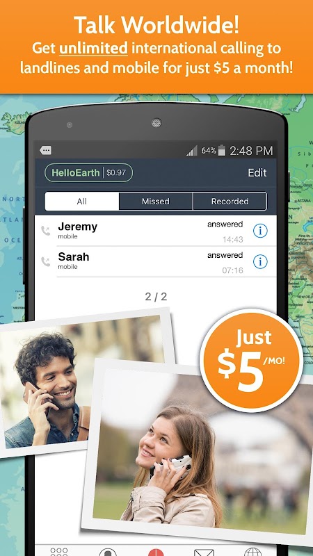HelloEarth provides high quality, low-cost International calling to landlines and mobile destinations around the globe. Pay as you go with the HelloEarth PAYGo Plan for less than 2¢ a minute or call as often and as long as you want back home in the U.S. or local numbers in other countries for up to 30 days for just $5 with HelloEarth’s UNLIMITED Plan.