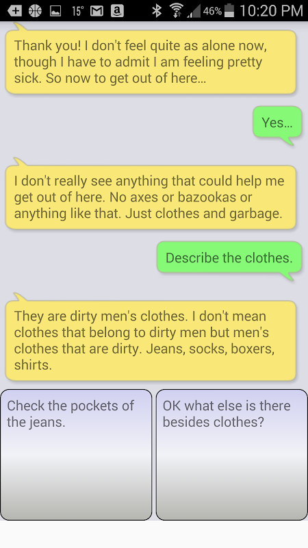 Aiuto Jim è un gioco di avventura di testo. Si tratta di un giocabile, ramificazione storia in cui le vostre risposte a determinare cosa succede dopo. Fate del vostro meglio per aiutare Jim e lui solo potrebbe sfuggire. Lo stile del gioco riproduce una applicazione di messaggistica di testo. La storia può essere completata attraverso percorsi multipli, in modo che merita più replay. E 'come un "scegli la tua avventura" gioco elettronico.