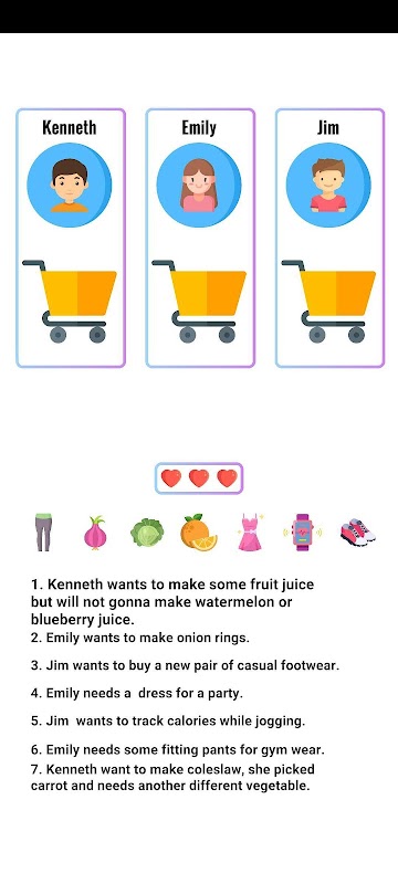 Un gioco di puzzle logico in cui risolvi enigmi per trovare le giuste corrispondenze nella lista della spesa per i clienti.