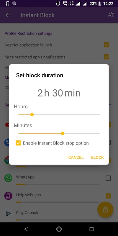 • Blocca istantaneamente le app : seleziona le app che distraggono e blocca le app all'istante per un periodo di tempo (fino a 60 minuti).
