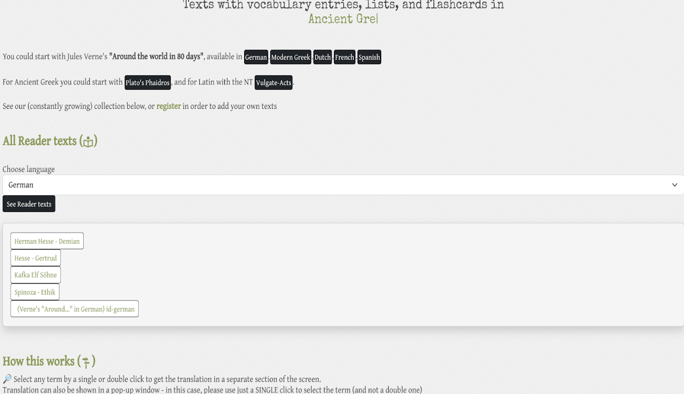 Testi con voci di vocabolario, elenchi e flashcard in tedesco, francese, latino, greco, greco antico, spagnolo e olandese.