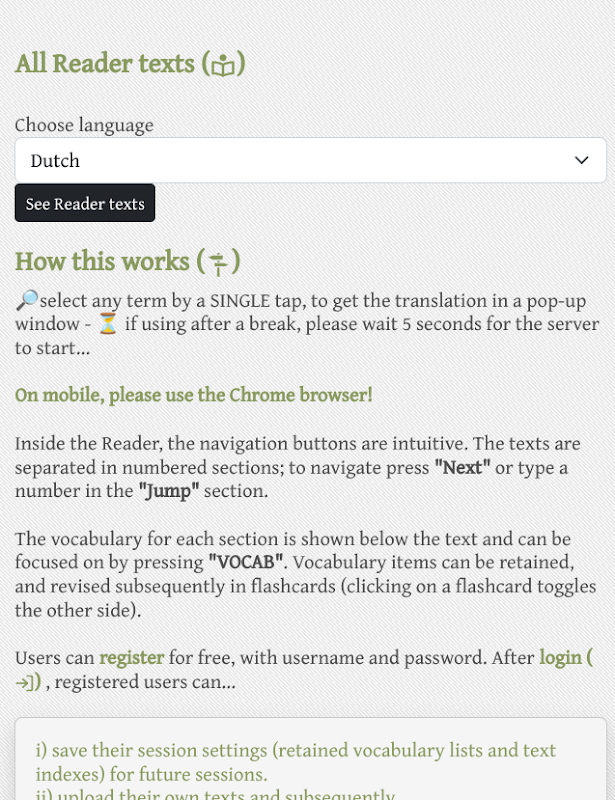 i) salvare le proprie impostazioni di sessione (elenchi di vocaboli conservati e indici di testo) per sessioni future.