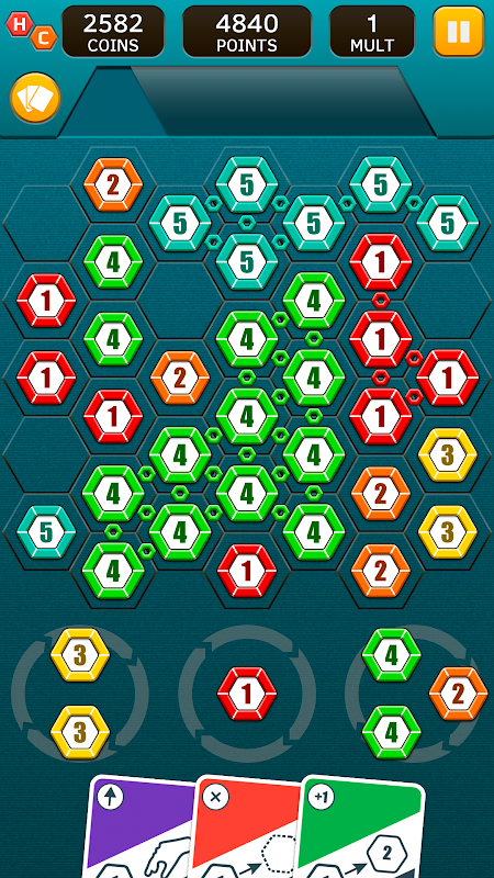 Creare e abbinare catene di stessi chip sul campo di gioco esagonale. Tre modalità di gioco.