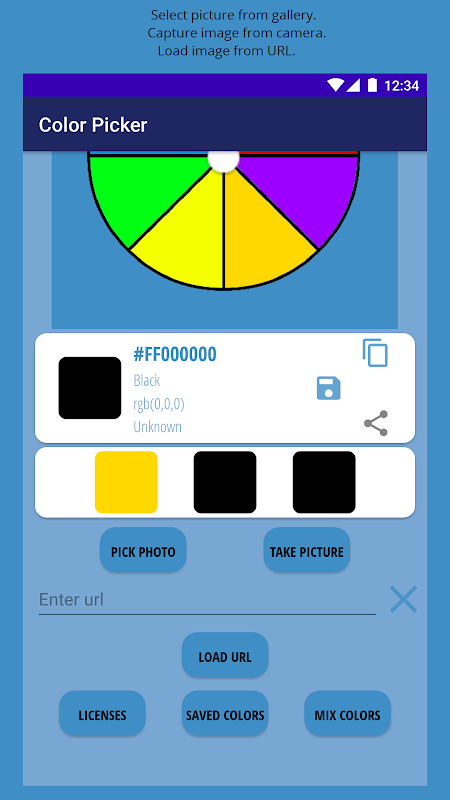 Le funzioni di base del Color Grabber sono scattare foto dalla galleria, caricare da URL o scattare foto dalla fotocamera, quindi identificare il colore.