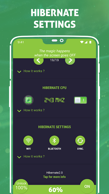 Thanks for downloading Hibernate: The Most Effective Battery Saver. Save and improve battery health of your device and enjoy prolonged use of your smartphone or tablet.
