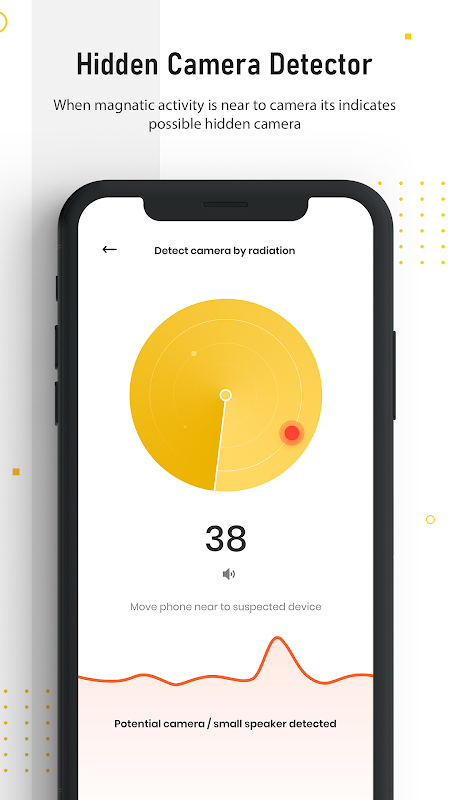 L'app di rilevamento telecamera nascosta ti protegge dalla telecamera spia. Se sei fuori città rimani in hotel con la famiglia, quindi per la privacy hai bisogno di tale rilevamento nascosto della telecamera e dell'app nascosta per il rilevamento del microfono attraverso la quale puoi scoprire la telecamera nascosta e la telecamera segreta. Usa il tuo smartphone e il cercatore di telecamere nascoste e spia l'applicazione di localizzazione di telecamere nascoste e avvicinalo a qualsiasi dispositivo di cui tu abbia dei dubbi.