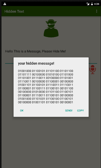 Have you ever wanted to share with your close friend a secret message that is human unreadable?Or even wanted to write your secret diary and save it as "some code" that your non-geeky nosy relatives cannot understand?..If yes, then Hidden Text app will help to record by voice or text your messages and then convert it to Binary codes (machine language) that human cannot understand. An easy to use app with simple user interface, what you need is to record your message or type it and then convert it 0 1 codes, copy it to a word file , or send an email to your self or share with your friend to have some fun.....Hidden Text app; when you realize that you are a geek !