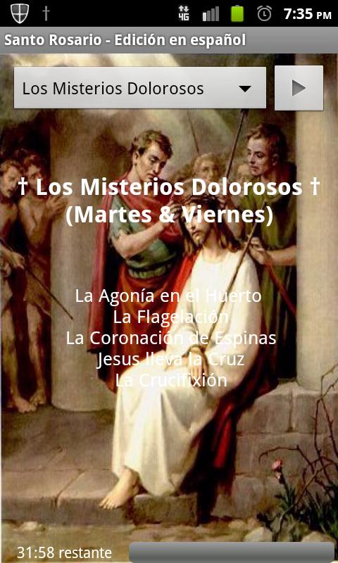 The appropriate mystery is loaded for that particular day when the application launches, or you can manually choose which mysteries you would like to pray along with.