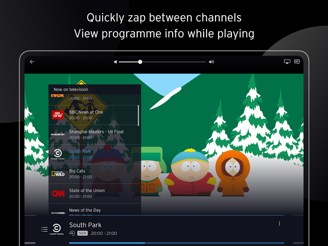 Horizon Go trasforma il tuo dispositivo in una TV in modo da poter guardare i tuoi programmi o film preferiti ovunque in casa. Puoi anche guardare alcuni canali mentre sei fuori casa e tali contenuti possono essere visualizzati anche in altri paesi dell'UE (a condizione che l'utente abbia un abbonamento da un fornitore di TV via cavo nell'UE). Quando si utilizza una connessione dati cellulare, potrebbero essere applicati costi per i dati mobili.