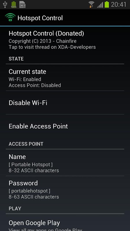 Hotspot Control è una piccola applicazione che abilita o disabilita la funzionalità hotspot portatile di Android. Di solito si può solo fare questo nelle impostazioni di Android, ma su alcuni dispositivi questa opzione è nascosta, o funziona solo se si dispone di una SIM inserita.