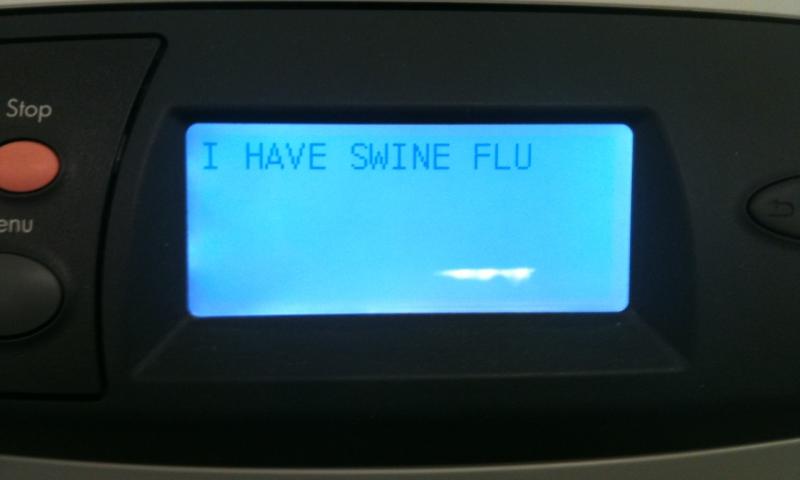 Divertimento stampante HP consente di modificare il testo di un display LCD su qualsiasi stampante HP LaserJet! Cosa si può fare con questo incredibile potere? Si potrebbe mandare qualcosa di divertente per il display LCD. che mette un sorriso sul volto delle persone, come il cambiamento bisogno di petrolio o HO L'INFLUENZA SUINA. Oppure si può pubblicizzare un evento aziendale. Come, Meeting @ 03:00.