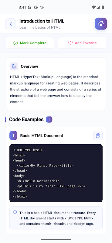 HTML Mastery è la tua guida completa per imparare l'HTML partendo da zero. Che tu sia un principiante alle prime armi con lo sviluppo web o che tu voglia rinfrescare le tue competenze, questa app intuitiva e accattivante rende l'apprendimento dell'HTML divertente ed efficace.