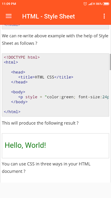 Questa app GRATUITA ti aiuterà a comprendere correttamente la sintassi HTML e HTML5 e ti spiegherà come progettare una pagina web usando HTML. Qui stiamo coprendo quasi tutti i tag, attributi, riferimenti. Il tutorial sequenziale ti consente di sapere dal livello base a quello avanzato.