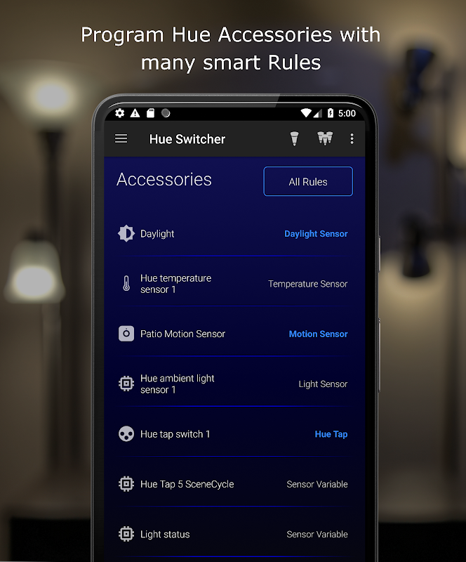 • Crea, elimina, recupera e rinomina i gruppi di luci sul tuo Philips Hue Bridge.