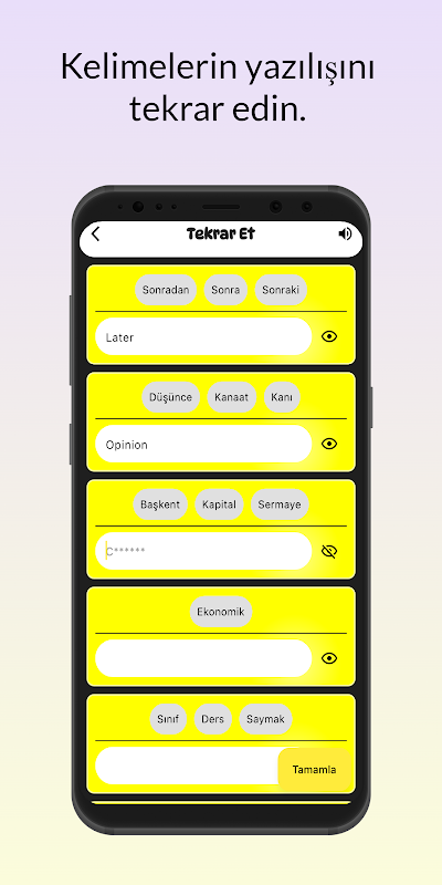 - Tahmin et bölümü eklendi. İngilizcesini gördüğünüz kelimelerin Türkçesini seçin.