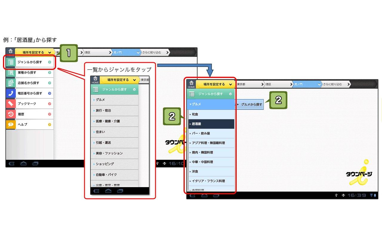 iタウンページの豊富な店舗・施設情報をタブレットの大画面で検索できます。