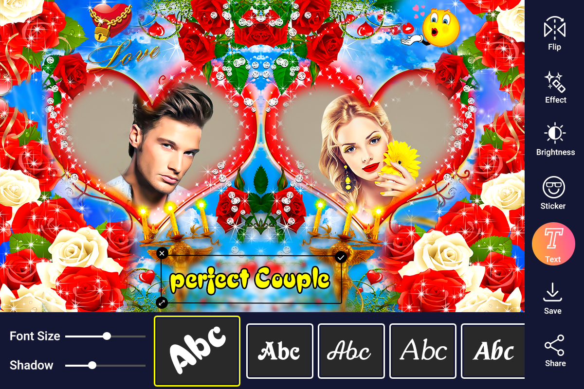 ☻ You can set Dual photos of your and yours love forever in frames to make romantic I Love You / love : photo frame. You can also either edit your photos with frames and other photo effects, by selecting photos from mobile gallery or you can use to click photo directly along with the frames.