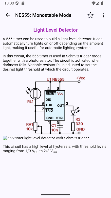 Oltre a tutorial e schemi elettrici, l'app include calcolatrici integrate per la stima di frequenza, temporizzazione, duty cycle e valore dei componenti, aiutando gli utenti a calcolare e regolare rapidamente i parametri del circuito. Tutti gli argomenti sono presentati con schemi elettrici chiari e spiegazioni dettagliate.
