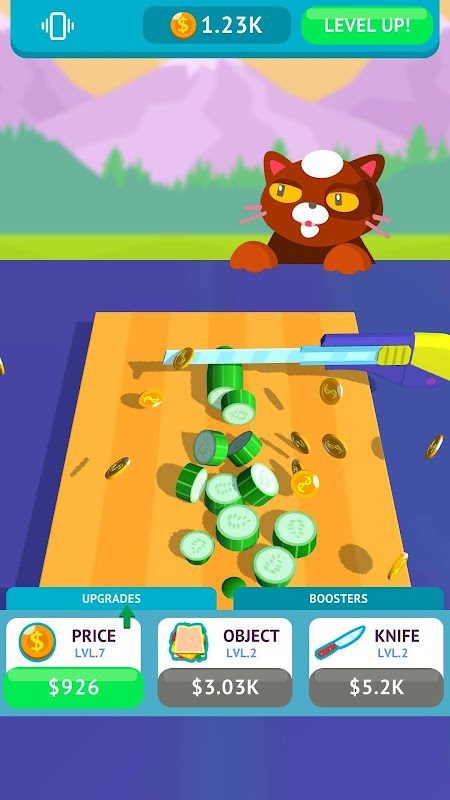 Master cutting with Idle Resolve It! Slice with the cat, improve skills!