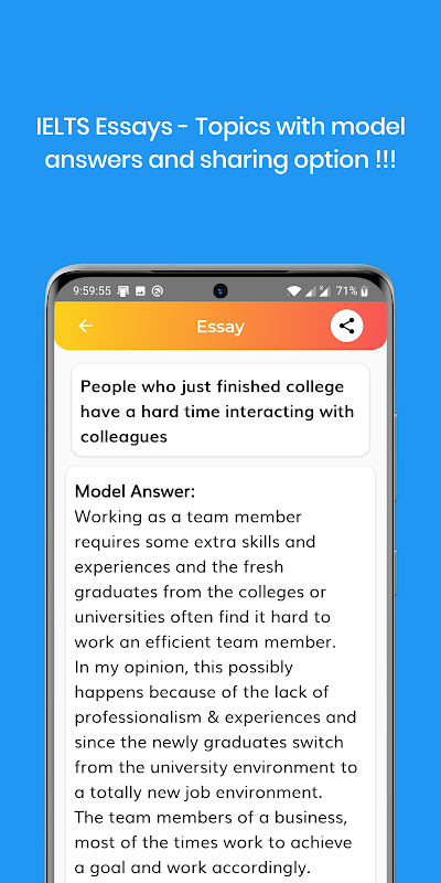 In questa nuova versione stiamo introducendo la pratica di saggi ielts con saggio di base, saggio intermedio e saggio avanzato con gli stessi argomenti con risposte modello.