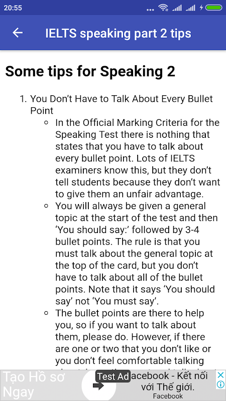 IELTS Parlando (pratica + Tips): offre gratuitamente campioni di contenuto che IELTS Preparazione app tra cui capacità di parlare in tutti rappresentati nei contenuti di esempio e consigli o trucchi da risolvere lezione di prova.