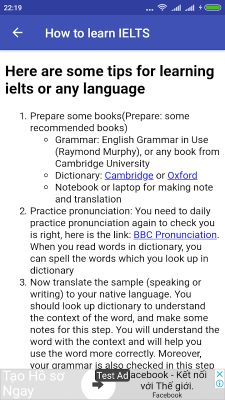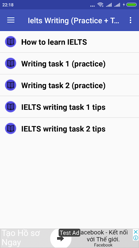 La Scrittura IELTS (Practice + punte) applicazione fornisce suggerimenti utili, esempi di praticare esercizi e lezioni interattive per aiutare a migliorare le capacità di affrontare e risolvere in ogni attività tipica. Seguendo suggerimenti e praticare diligentemente si otterrà punteggio atteso al test IELTS.