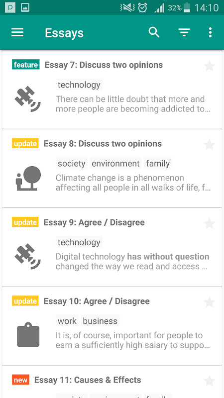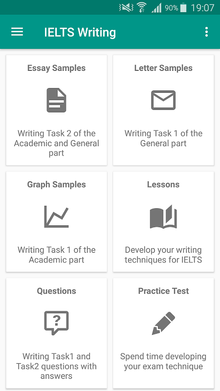 Lezioni gratuite di autoapprendimento, campioni e domande sulla scrittura IELTS ti forniranno suggerimenti e informazioni sugli esami, che ti aiuteranno a prepararti con successo per il test IELTS e ottenere il punteggio necessario. Fare test fittizi ti aiuterà ad aumentare le tue possibilità di ottenere un punteggio più alto. Poiché l'applicazione è autoapprendimento, puoi selezionare la parte su cui concentrarti per prepararti per il test di scrittura IELTS. Puoi utilizzare questa applicazione in modo illimitato senza costi nascosti.