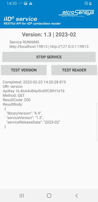 Questa app implementa la comunicazione con i lettori RFID senza contatto iID® e fornisce un'API RESTful ad app di terze parti sullo stesso dispositivo (o qualsiasi dispositivo host nella stessa rete).
