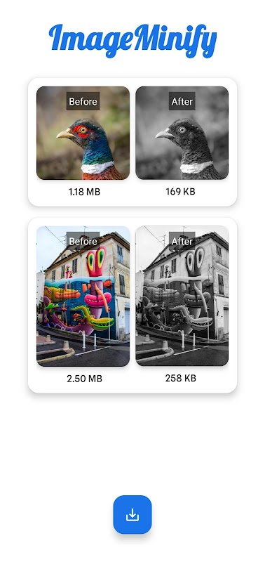 Trasforma le tue immagini da MB a KB senza sforzo in blocco con ImageMinify! Creata da uno sviluppatore dedicato, questa app intuitiva comprime più file di immagine contemporaneamente mantenendone la qualità, rendendola perfetta per chiunque desideri ridurre le dimensioni del file senza sacrificare la chiarezza.