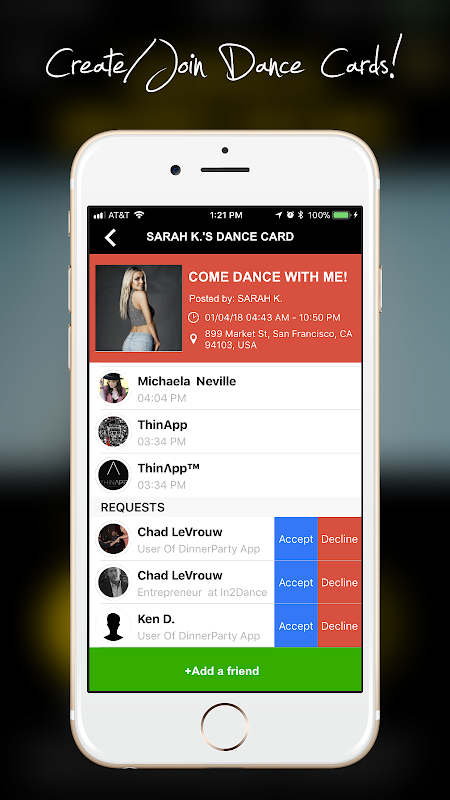 In2Dance uses regular location GPS to help you find nearby dancers and uses background GPS location tracking to show you real-time alerts for Dance Events going on around your immediate location, as well as helping you connect with other dancers in real-time.