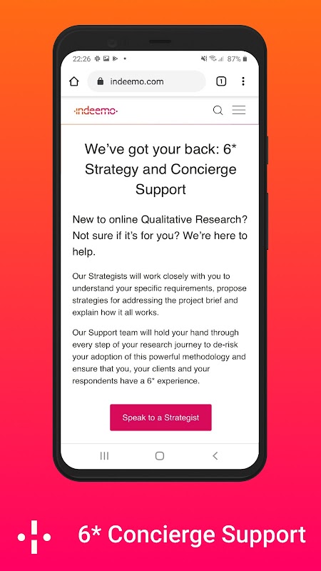 La piattaforma di ricerca etnografica mobile di Indeemo consente ai partecipanti di catturare e ordinare istantaneamente e con facilità pensieri e opinioni e di condividerli in tempo reale con le agenzie di ricerca qualitativa ed i brand. Indeemo è il supplemento ideale alle metodologie di ricerca tradizionali, come gruppi di discussione o interviste in profondità, in grado di trasformare le fasi preparatorie della ricerca e quelle successive in un’esperienza che diverta e coinvolga i partecipanti.