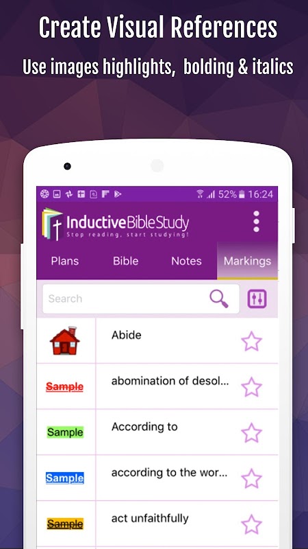 Quando si inizia lo studio di ogni passaggio, si vedrà un'introduzione stile devozionale seguita dai suoi versi di messa a fuoco e gli studi di parola delle parole chiave importanti che la Scrittura. È inoltre possibile creare facilmente le marcature per tali parole chiave. I piani di studio penetranti trovati in app fanno interpretazione delle parole del nostro Signore Gesù facile con l'aiuto di commenti, immagini e video.