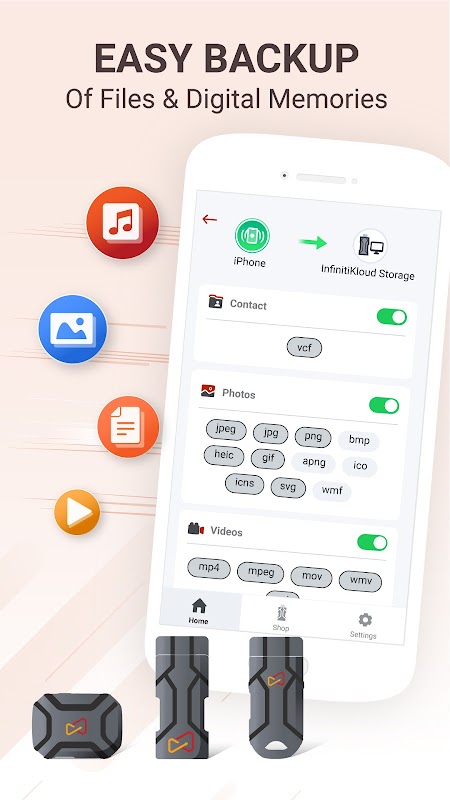 Il tuo spazio di archiviazione wireless è infinito con InfinitiKloud. L'app ti aiuta a salvare tutte le tue foto, comprese le immagini personali, le foto animate e i file di icone, nonché i video nei formati più popolari come MP4, MVW, Avi, QuickTime e MPEG.