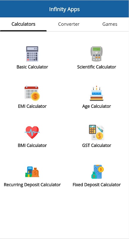 Infinity Apps è un'app all-in-one ed ha la metà delle dimensioni di un'applicazione comune come calcolatrice EMI, calcolatrice scientifica, calcolatrice dell'età ecc. In questo modo risparmierai molto spazio di archiviazione, tempo e frustrazione alla ricerca di tutti i strumenti quotidiani di cui hai bisogno.