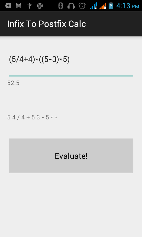 This app turns simple infix expression into postfix expression. It also shows the result of the calculated value.