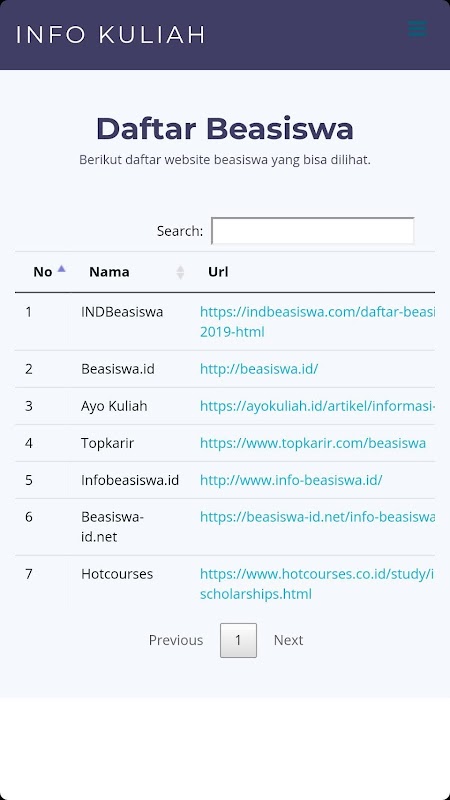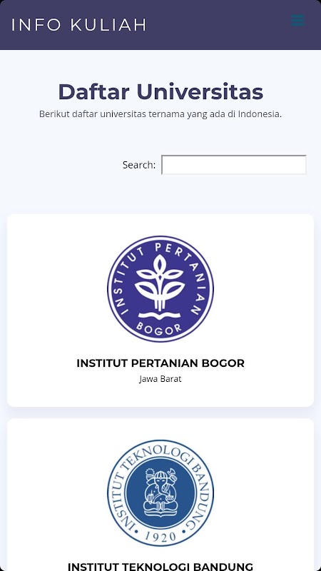 Aplikasi Info Kuliah merupakan aplikasi berbagi informasi tentang perguruan tinggi negeri yang ada di Indonesia. Aplikasi ini bertujuan supaya pengguna dapat mengetahui informasi apa saja yang dibutuhkan untuk melanjutkan pendidikan ke jenjang perguruan tinggi. Pengguna aplikasi ini nantinya dapat mengetahui informasi mulai dari program studi yang disediakan oleh universitas negeri yang ada di indonesia, daya tampung tiap program studi, dan jumlah peminat program studi. Selain itu, juga terdapat informasi terkait beasiswa serta info penting mengenai Seleksi Nasional Masuk Perguruan Tinggi Negeri (SNMPTN) dan Seleksi Bersama Masuk Perguruan Tinggi Negeri (SBMPTN).
