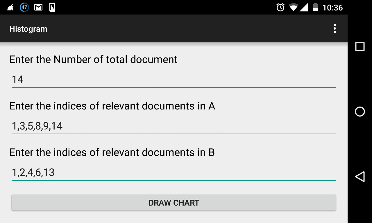 this app show the Recall and precision detail of ir evaluation and show the chart of recall vs precision and histogram chart , and E-Measure and F-Measure , also there is IR Modeling