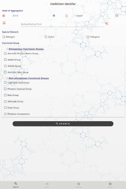 Il programma è un database in continua espansione, che attualmente presenta oltre centinaia di campioni organici insieme ai relativi dati fisici, comportamento chimico e metodi dettagliati che coprono una gamma di formazione di derivati per ciascun campione. Questo strumento è reso disponibile per sfogliare il set di dati, raccogliere dettagli sperimentali rilevanti e testare le tue abilità di chimica organica necessarie per identificare il composto organico sconosciuto assegnato.
