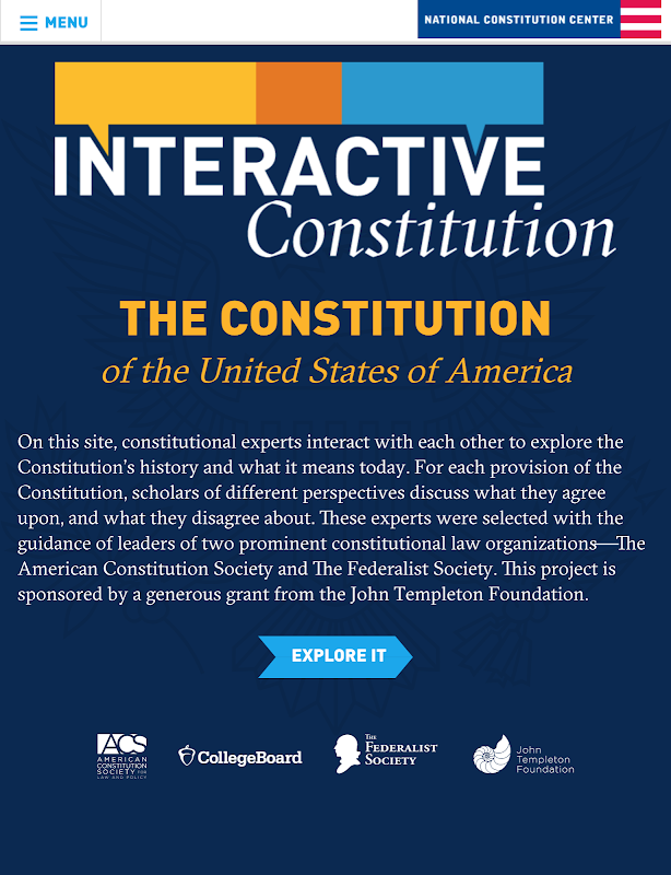 The free Interactive Constitution app presents the full text of the U.S. Constitution and features essays by leading scholars that detail areas of agreement and disagreement across a range of philosophical and legal perspectives. Created by the National Constitution Center in partnership with the American Constitution Society and the Federalist Society, this nonpartisan resource is featured by the College Board in its Advanced Placement history and government courses. The Interactive Constitution was made possible by a grant from the John Templeton Foundation.