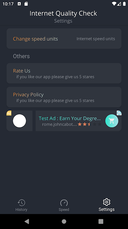 This application help you check the speed of your connection and save it automatically to compare it using history dashboard.