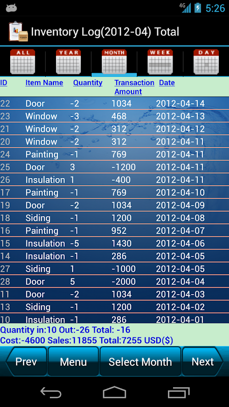 • Detail view and summary: User can see yearly, monthly, weekly and daily Inventory Log detail and summary. By click on the menu button on the phone, user can use data type filters.