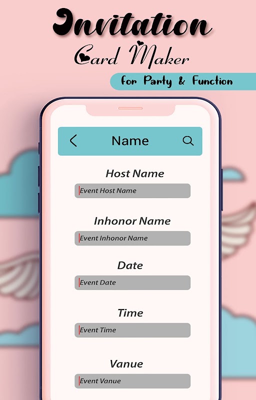 Crea bellissimi biglietti d'invito per ogni occasione come matrimonio, fidanzamento, baby shower, festa di compleanno, festa per l'inaugurazione della casa, festa di laurea ecc. E invita i tuoi amici e familiari inviando biglietti d'invito RSVP via e-mail o qualsiasi altra piattaforma di social network direttamente dall'app .