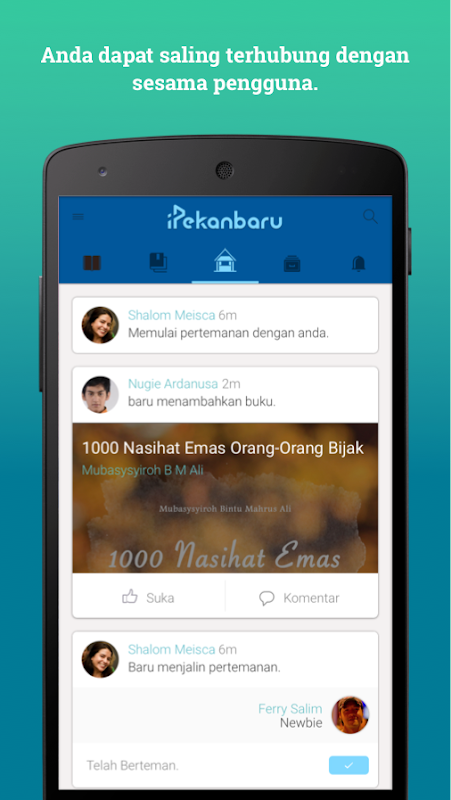 - Feed: Untuk melihat semua aktifitas pengguna iPekanbaru seperti informasi buku terbaru, buku yang dipinjam pengguna lain dan beragam aktifitas lainnya.