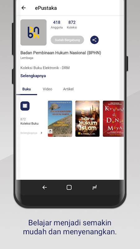 - Collezione di libri: questa funzionalità ti consente di esplorare migliaia di titoli di ebook su e-PusBPHN. Seleziona il titolo desiderato, prendilo in prestito e leggilo a portata di mano.