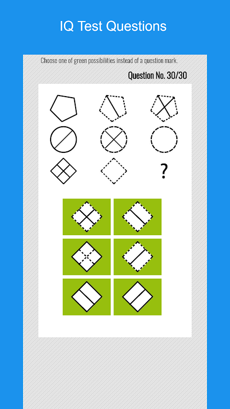 "IQ Test" è un'app divertente e coinvolgente progettata per testare e sfidare le tue capacità cognitive. Con 30 domande elaborate con cura, questa app ti offre una visione completa delle tue capacità logiche, spaziali e di riconoscimento dei modelli. Perfetto per chi ama i giochi cerebrali, i puzzle e le sfide intellettuali, "Test del QI" ti aiuta a misurare il tuo QI divertendoti.