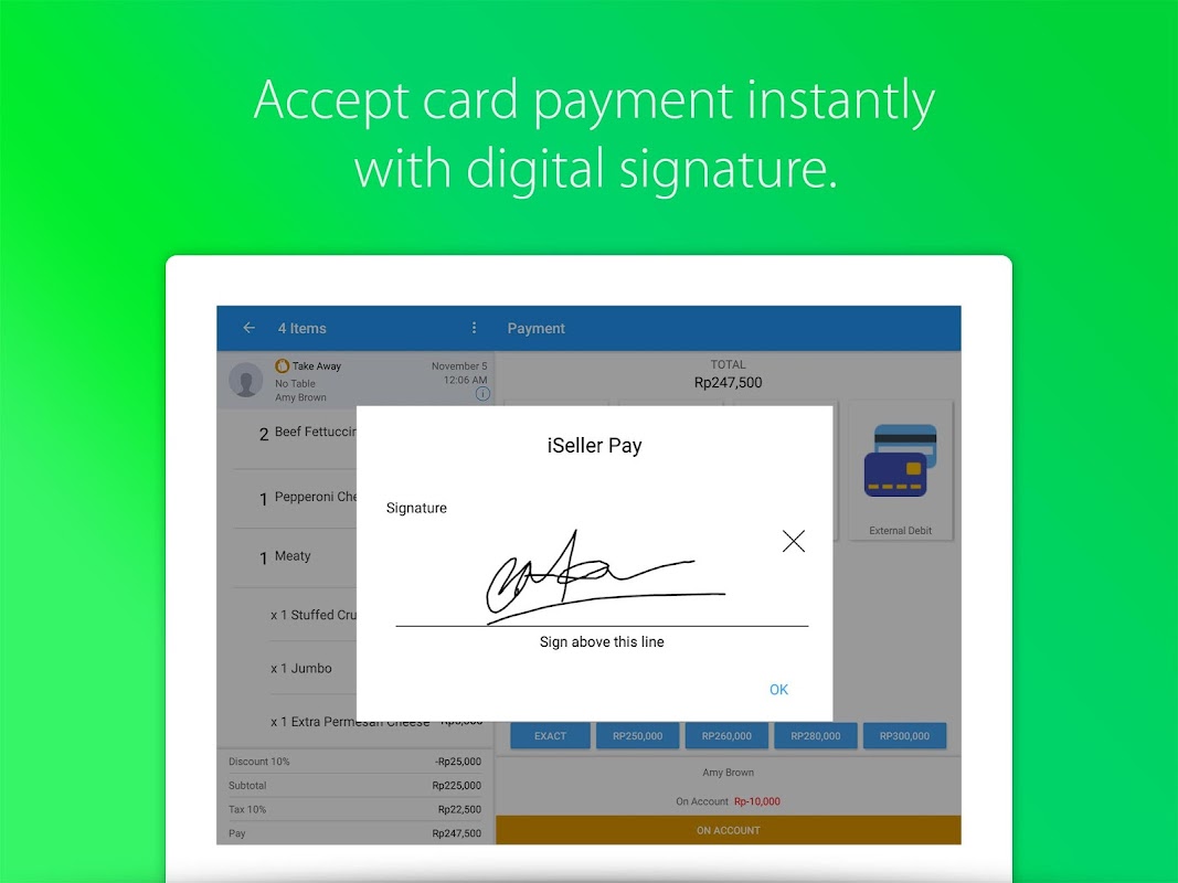 • Accettare pagamento con carta istantaneamente con il lettore di schede integrato e cattura della firma digitale.