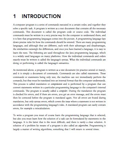 convert statements written in a particular programming language to the computer’s internal commands. The program is usually called a compiler. During the translation the program is checked for errors, and if there are errors, you get an error message, and the errors must then be corrected before the program is translated again. Not all errors are found during translation, but only syntax errors, which covers the issue where a statement is not written in accordance with the programming language’s rules. A translated program can easily contain errors, for example a miscalculation. To write a program you must of course learn the programming language that is selected, but also you must learn how the solution of a task can be formulated by statements in the language. It is the latter that is the most difficult, and there is rarely a clear solution. A solution of a problem by means of a program is also called an algorithm. Programming is largely a matter of writing algorithms, something that I will return to several times.
