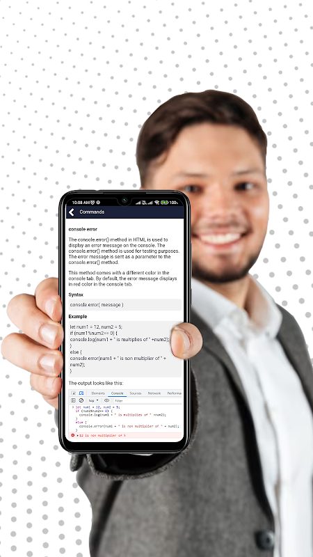 Javascript Console può anche essere chiamata console js, nell'applicazione abbiamo progettato il compilatore javascript per compilare qualsiasi tipo di codice javascript. Inoltre, questa applicazione Javascript Pro contiene alcuni esempi per facilitare l'apprendimento e la comprensione degli utenti. Quindi l'utente può facilmente imparare la programmazione JavaScript in due giorni.