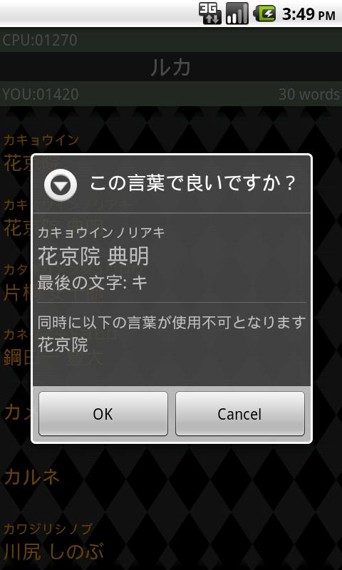 リストの中から最初の言葉を選択し、以降、相手(CPU)が選択した言葉に続く言葉をリストから選びゲームを進めていきます。