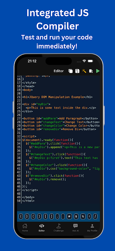 Generazione di codice AI: l'intelligenza artificiale dell'app può generare codice jQuery per te in base a semplici comandi. Hai bisogno di un ciclo for in jQuery? Basta chiedere all'IA e genererà il codice per te. Questa funzionalità è perfetta per imparare tramite esempi e vedere come i concetti jQuery vengono applicati in situazioni di codifica reali.